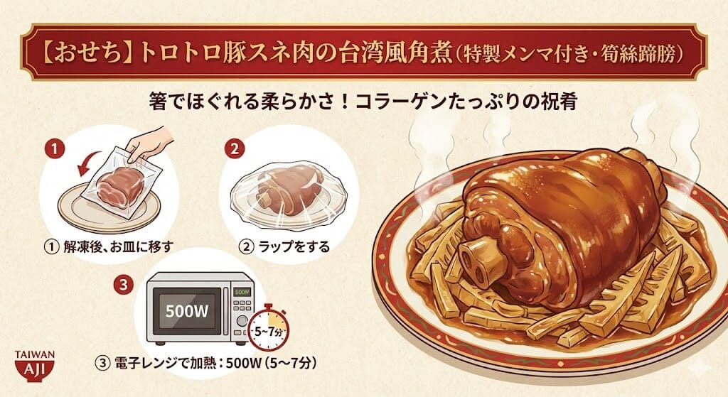 【お召し上がり方】 湯煎(ボイル)で温めるだけで、本格的な台湾のご馳走が完成します。チンゲン菜などを添えると、より豪華な一皿になります。