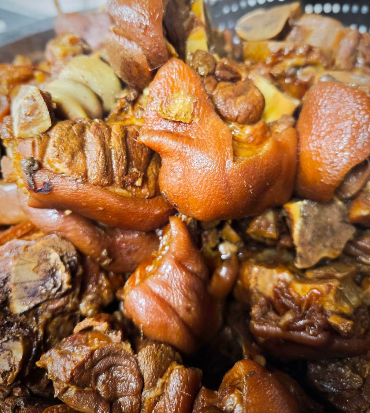 とろける食感: 箸で切れるほど柔らかく煮込んだ豚肉は、口の中でとろけます。コラーゲンたっぷりで、脂っこくなく、濃厚な旨味が広がります。