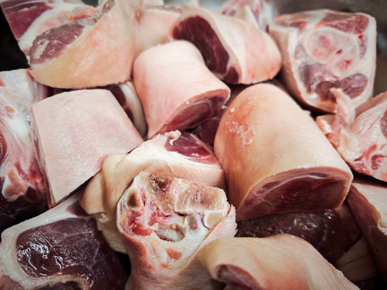 国産豚肉のすね肉を骨付き、ショウガ、醤油(濃い口)、オイスターソース、筍、砂糖、など。3時間をかけてじっくり煮込み。
